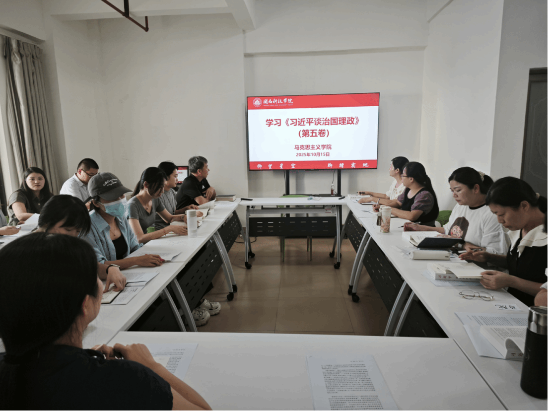 10月15 日,马克思主义学院召开支部理论学习会,专题学习《习近平谈治国理政》第五卷。会议由学院党支部书记、副院长林雪珍主持,全体党员参会。