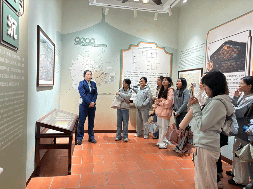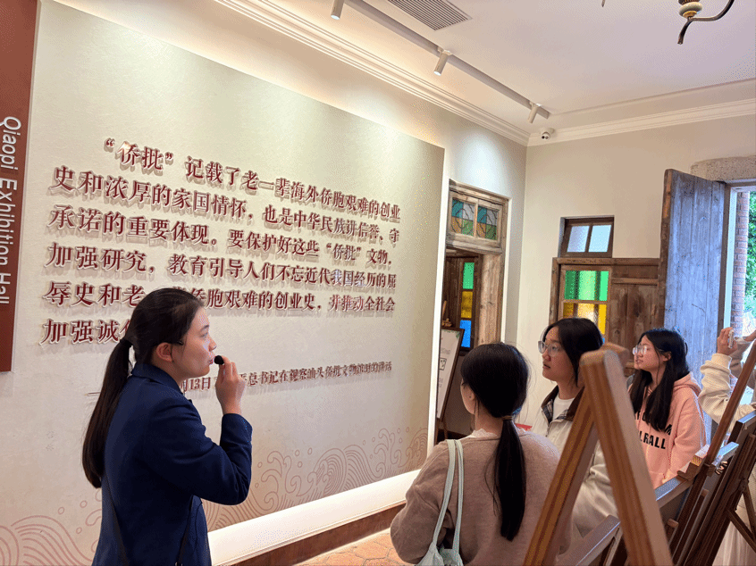 活动当天,学子们首先在梧林村落入口处集合,手持“社会实践队”旗帜与古厝建筑合影留念。在讲解员的带领下,大家漫步于百年侨厝间:从红砖燕尾脊的闽南古建,到融合南洋风格的番仔楼,斑驳的石墙、精致的瓷雕栏杆,都诉说着侨胞“下南洋”的奋斗史;而展厅内的侨批实物、姓氏源流地图,更让同学们直观感受到侨民跨海传信、心系桑梓的家国情怀。