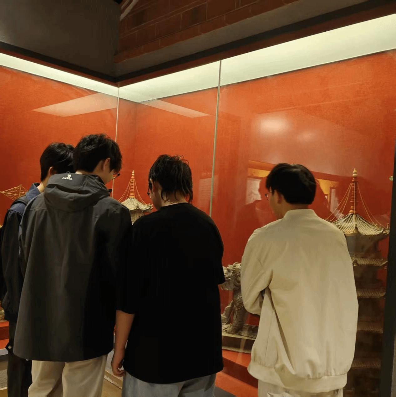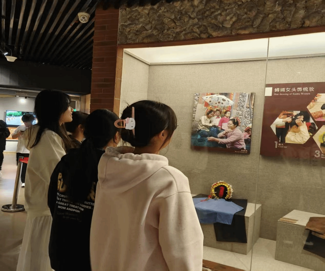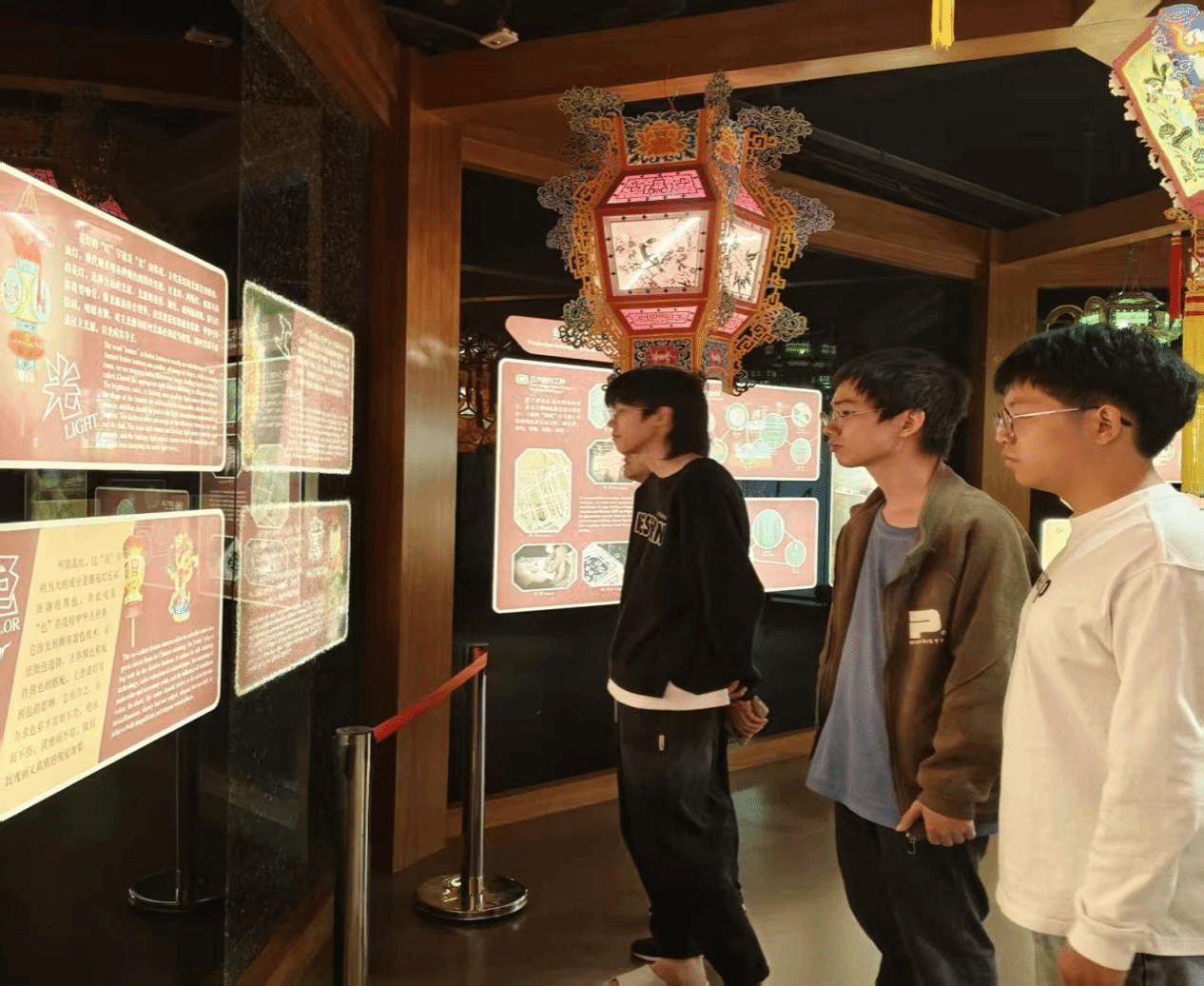这座建筑面积达9000多平方米的非遗馆内,是集中展示闽南文化精髓、彰显宋元中国世界海洋商贸中心非遗魅力的重要窗口。步入馆内,同学们沉浸于璀璨的非物质文化遗产世界:流光溢彩、造型各异的泉州花灯,凝结着民间智慧与佳节祥韵;巧夺天工的永春竹编,于经纬交织中演绎着指尖上的艺术;典雅绚丽的闽南传统服饰,一针一线承载着地域风情与历史记忆;悬丝傀儡、掌中木偶戏,方寸舞台演绎着百态人生与古老故事;“中国白”德化瓷器,温润如玉,尽显千年瓷都的技艺巅峰;精细纤巧的泉州刻纸,在方寸之间刻画万象;此外,南音、美食、木偶戏、闽南传统建筑营造技艺等众多非遗项目,也深深吸引了同学们的关注。